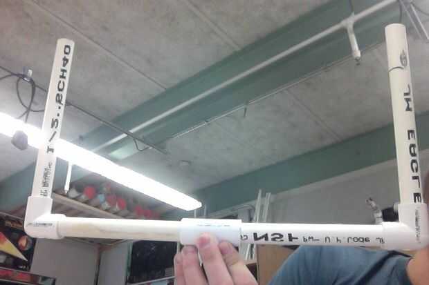 de la V se necesita:-12 en PVC (2)-codo de 90 gradosPara la R se debe:-pipa 12 en PVC (2)-tubo 6 en PVC (5)-tubo 3 en PVC-90 grados de codo (3)-T (2)-codo 45 gradosPaso 1: A partir de la V -Cortar un tubo de PVC para ser 15 en de largoPaso 2: Parte i