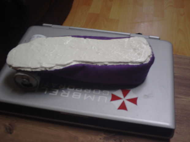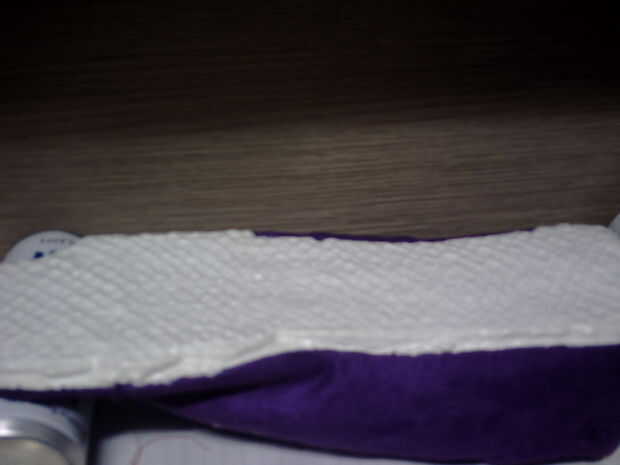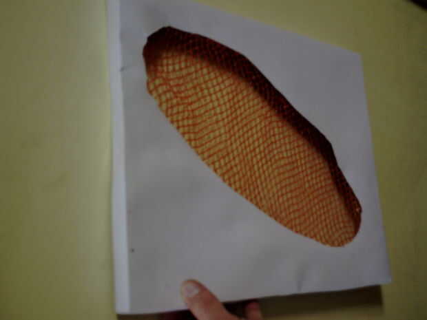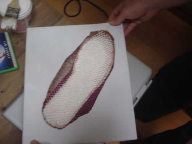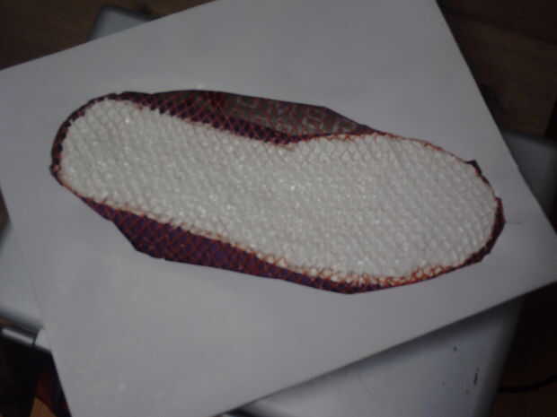 En la última capa, tomé un material de malla más ancho (una de esas bolsas de malla que naranjas o cebollas, ver figura 2) y que puesto encima de la planta del pie (también construí un marco de cartulina alrededor de él para ayudar a mantener su forma, cuadros 4 y 5), luego pintado goma sobre él (Foto 5) y luego se retira la malla (fotos 6 7 y 8), dejando atrás el patrón de la malla en el caucho (cuadro 1). Resultó diferentemente de lo que esperaba, pero aún se veía bien. Puede pintar algún tipo de esmalte transparente encima de la goma una vez su si seca la suela de goma es demasiado pegajosa. Caminando en los zapatos hará menos pegajosa, pero también un poco sucio.