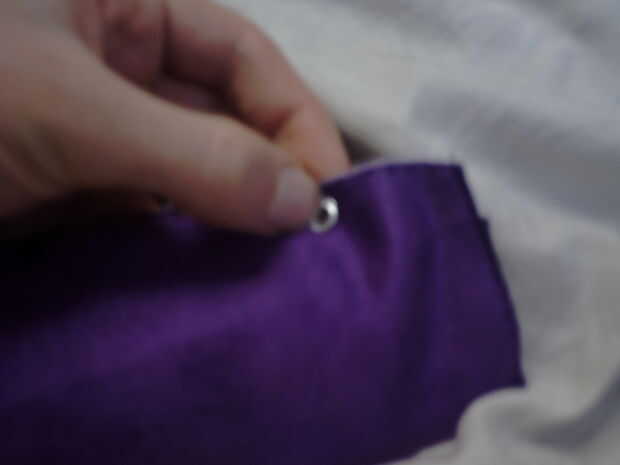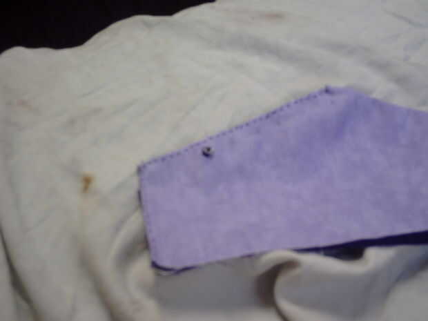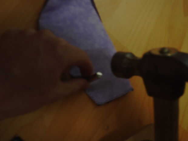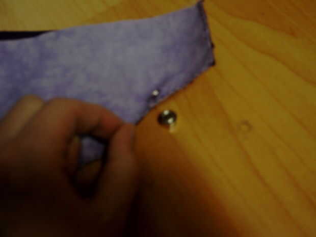 Usar ojales es fácil, que cortar una pequeña Cruz en forma de agujero en la tela (imagen 2). Empuje el ojete a través de la tela (de exterior a interior, imagen 3 y 4). Coloque el ojal hacia abajo en el yunque (imagen 5). Coloque la herramienta en la parte superior y un martillo abajo (imagen 6). Las instrucciones dicen para martillo suavemente, pero usted tiene que golpear bastante duro. No te pierdas el yunque, se dañará su ojete y no pueden ser quitados fácilmente.