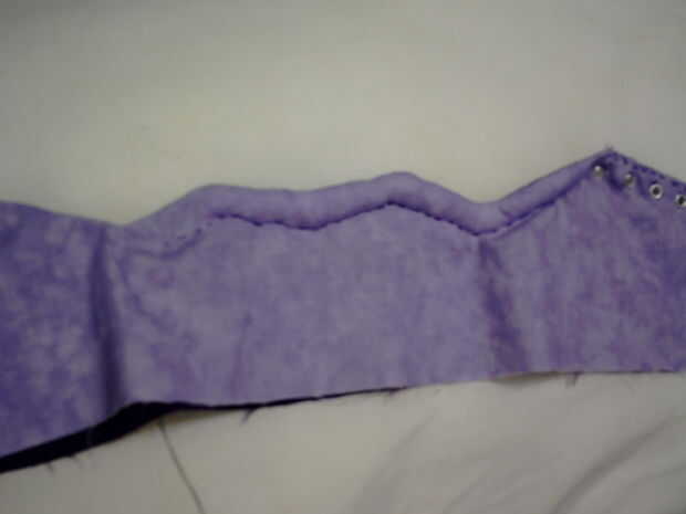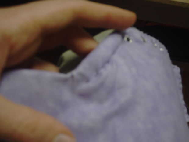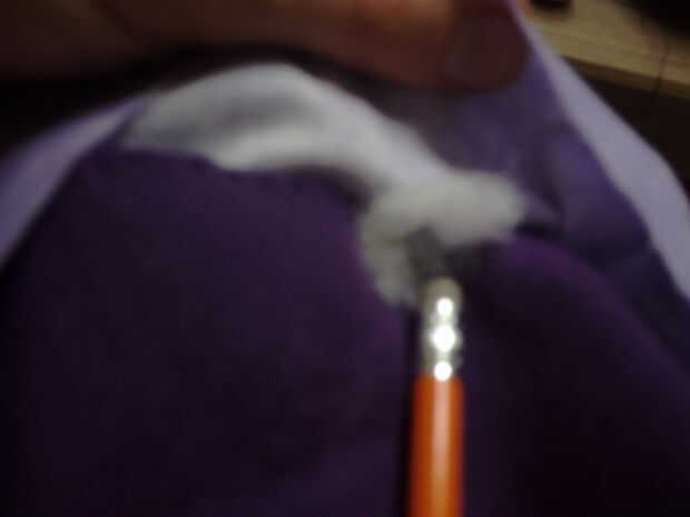 Tomar la pieza de calzado principal otra vez, empezar costura debajo del primer pico otra vez y terminar justo debajo del último pico. Estás haciendo un bolsillo alrededor del borde de la zapatilla que llenará de relleno. Usted debe llenar con relleno como usted coser, parar cada pocas pulgadas para añadir más relleno. Usé un lápiz y un palillo para empujar el relleno ahí. Véase el cuadro 4. No coser demasiado sin agregar el relleno, si lo haces, te arrepentirás. No arruine su zapato, pero hace más difícil conseguir el relleno hay profundidad suficiente.