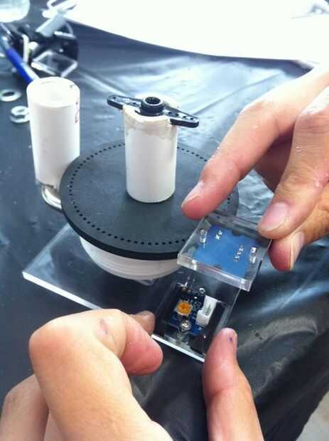 Hemos hecho uso de los siguientes sensores: Sensor de luz con LED de salida pantalla de servo LCD de 360 grados. Nosotros a la medida un aparato para sostener una cerradura de combinación para comprobar la tensión del grillete que gira a través de código posibles de la combinación. Para determinar hasta qué punto dejar, usamos detección óptica (como luz) a través de una plantilla rotatoria a la perilla de la cerradura. A medida que gira la cerradura, puede detectar su punto inicial y final de girando de forma que puede girar hasta el siguiente número. La construcción mecánica 6-7 horas para bosquejar y la programación e integración tomó 10-12 horas para construir.