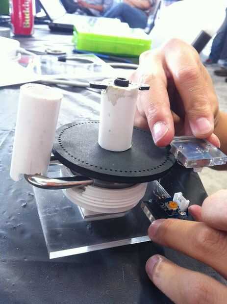 Aquí hay dos perspectivas del prototipo junto a cabo (ver fotos). Nota los detectores de luz y el disco negro con los agujeros perforados para detectar la posición del dial.