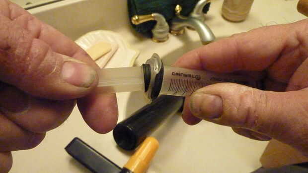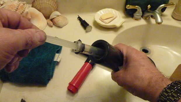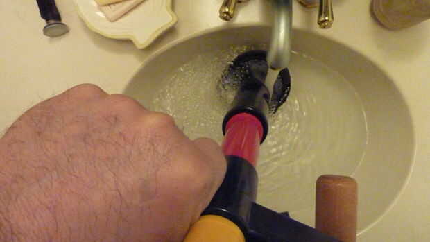 Coloque el extremo del negocio del drenaje Kleer en el desagüe y empuje hacia abajo sobre los mangos. Tan pronto como el émbolo hace el viaje desde la parte superior de la jeringa hasta el fondo, va a explotar con el sonido más satisfactorio que nunca vas a escuchar saliendo de plomería de su casa.