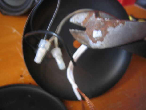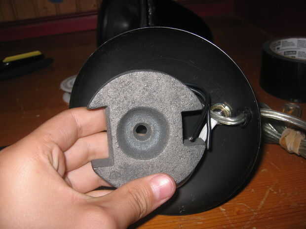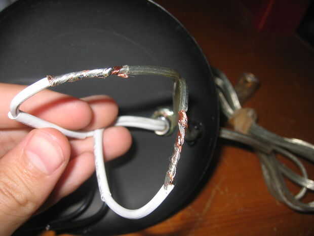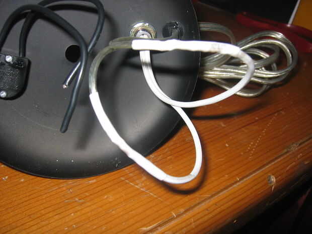 Desatornille la placa inferior de la lámpara revelando todos los alambres de los cables, luego cortar los cables que están conectados al switch y conectar los cables que pasan por el brazo a los cables que van al enchufe. y otra vez no se olvide usted encoger tubos. una vez listo poner el peso en y atornille la placa.