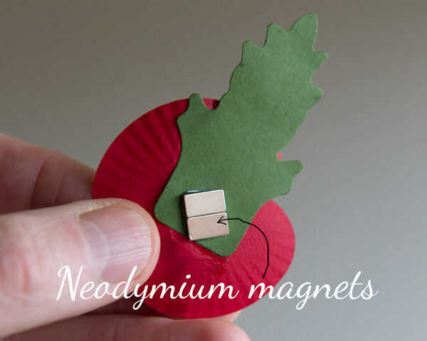 Acabar con la amapola pegando un imán de neodimio fina, tamaño convenientemente en la parte posterior de la amapola. Un círculo de 10mm sería perfecto pero el imán dos de 5 x 10mm que usé funcionó bien.