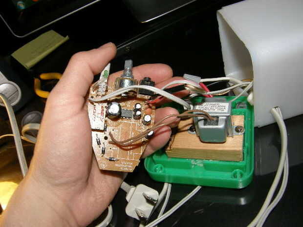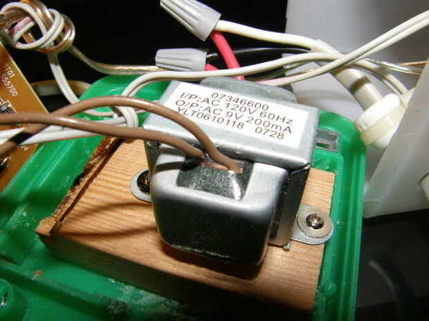 Aquí están unas cuantas fotos más para mostrar la tarjeta y cómo fija el transformador a la carcasa "cool Cube". Recuerde que puede usar cualquier caja de proyecto que desee.  I cortar un bloque pequeño de pino y usado una dremel para cortar el soporte de la batería. Usé el taladro y brocas múltiples para localizar los orificios para cables etc. en mi caja de proyecto.