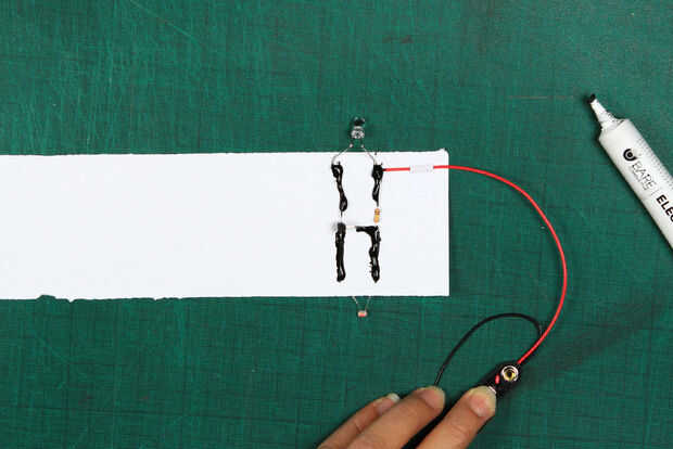 A continuación, necesitará añadir el clip de la batería a su circuito. Soldadura fría la + cable (rojo) por la pierna derecha del LED.