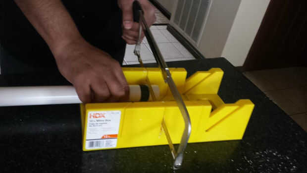 Sugerencia: Utilizando cinta aislante hace muy fácil de hacer incluso cortes en la caja de ingletes. También rotar la tubería una vez que el corte está a medio camino a través de conseguir un todo redondo corte incluso en el tubo.