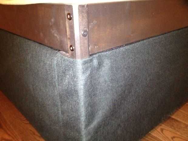 Determiné la altura final de la falda, midiendo desde la parte inferior del riel lateral hasta el suelo y la deducción de 1 pulgada. Luego agrega 1/2 pulgadas a esa medida y cortar las tres piezas. La longitud de cada pieza era de 12 pulgadas más largos que la longitud real de la cama.