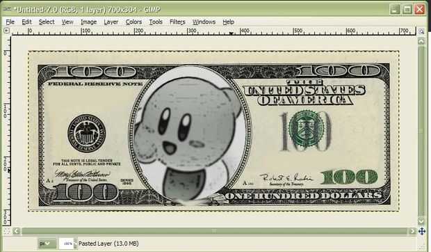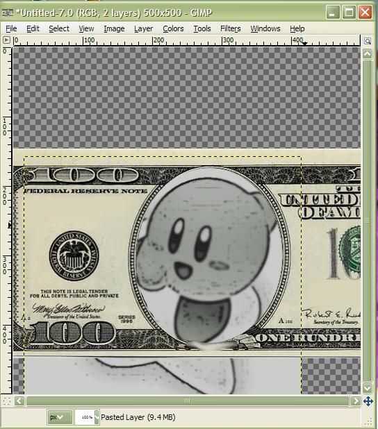 En la imagen utiliza como una cara, haga clic en archivo > abrir como capas y abrir el dólar con la cara cortada que hiciste anteriormente. Escala y mover la imagen de la cara y, si es necesario, lo oscurece. Recortar la cara para que no se pega hacia fuera si usted tiene a. Por último, la imagen > fusionar capas visibles, y se encuentra en un dólar!