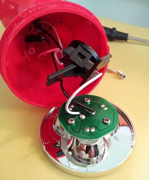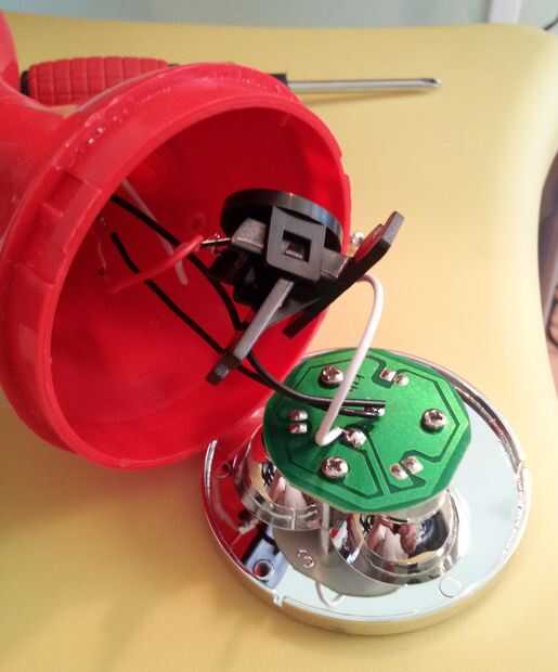 Suelde el cable rojo (positivo) al blanco donde conecta con el interruptor del condensador encontró más lejos dentro de la linterna (no donde el cable blanco conecta con los bulbos del LED). Hacerlo rápidamente para no desoldar el cable blanco del interruptor de terminal.