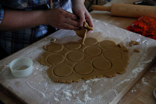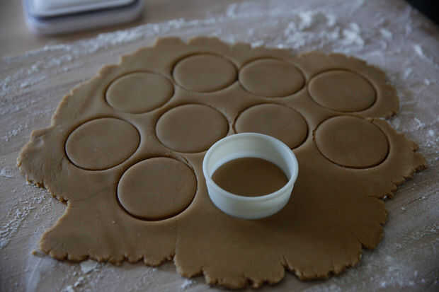 Yo rodé la masa para fuera a aproximadamente 1/8" de espesor y luego utiliza un cortador de galletas para cortar la masa. Mantener poco de harina para enharinar la superficie de rodadura, así como el perno de balanceo.