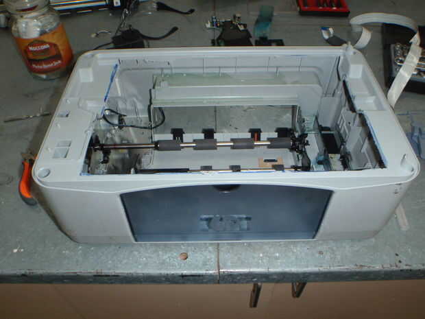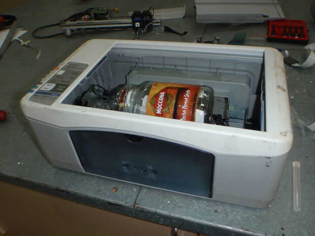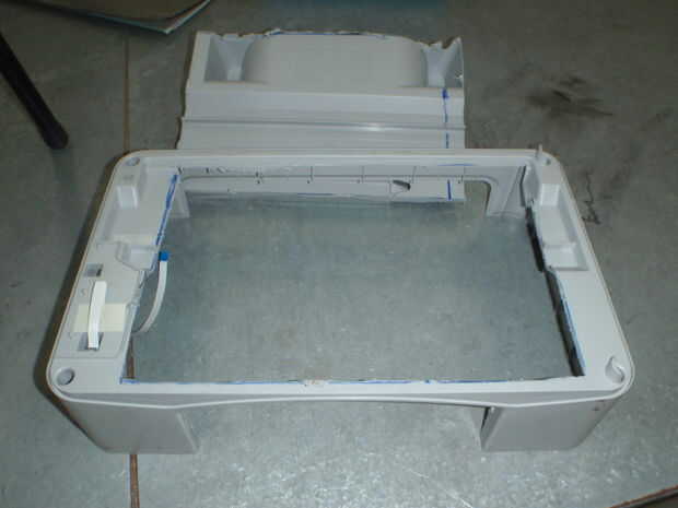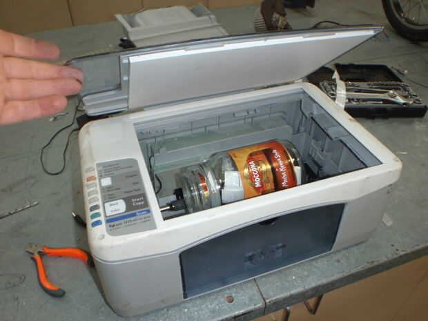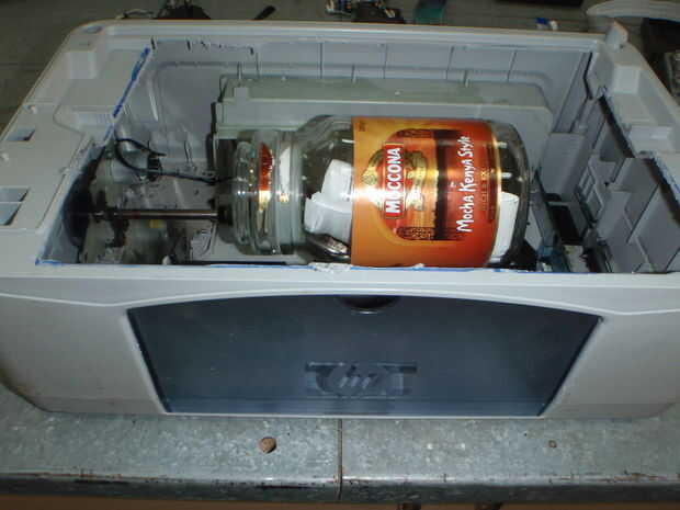 La base es marcada hacia fuera y un orificio cortado con una sierra de vaivén, antes de que se ha vuelto a montar. Vasos pueden ser bastante ruidosos y es sorprendente cuánto golpear la tapa en reduce el sonido de la cantidad que sale de la máquina.
