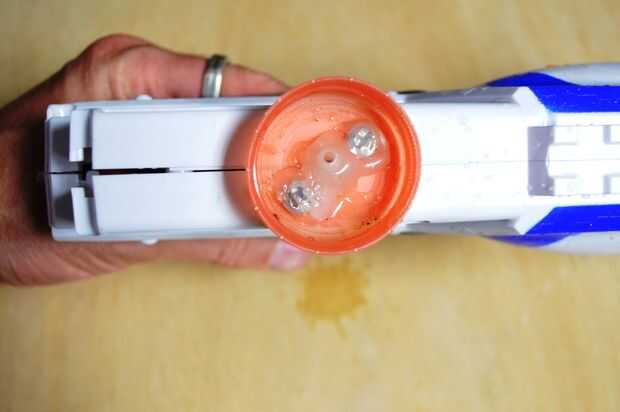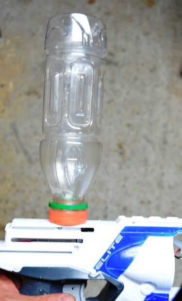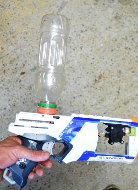 1. Taladre 3 agujeros en la tapa de la botella. Uno en el centro para la salida del codo y 2 para los tornillos que servirán para unir la tapa a la pistola.
