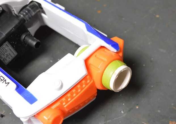 3. a continuación tiene un pedazo de tubo de PVC de 15mm y añadió alguna cinta de enmascarar. Entonces empujó en el extremo de la pistola de nerf.