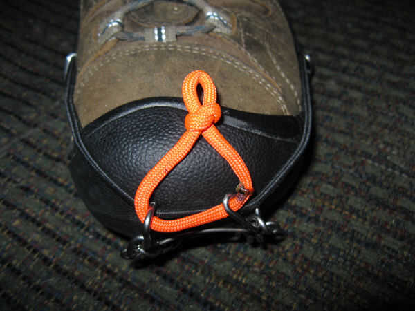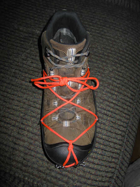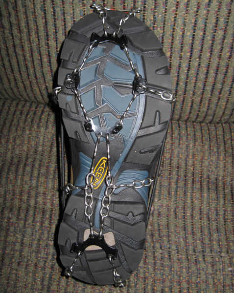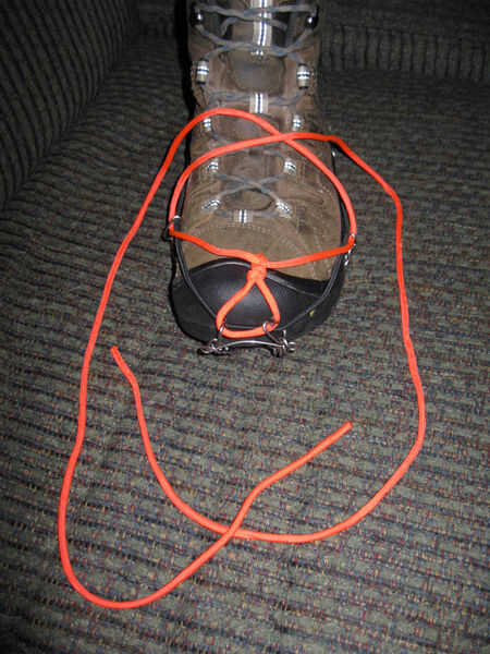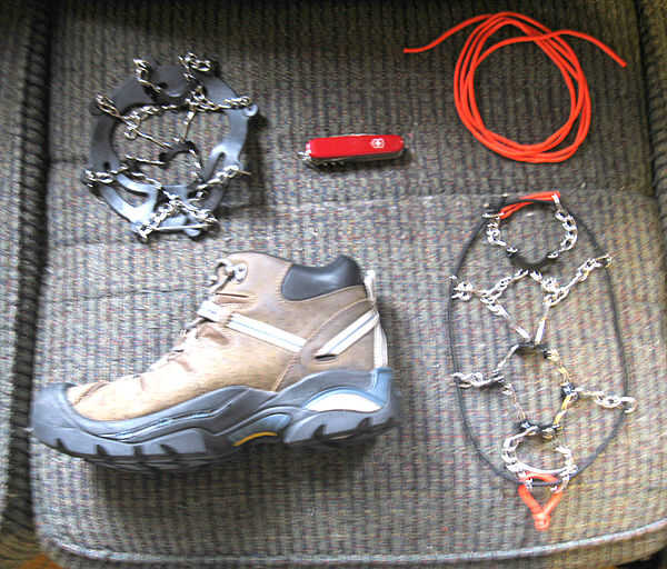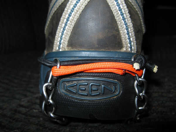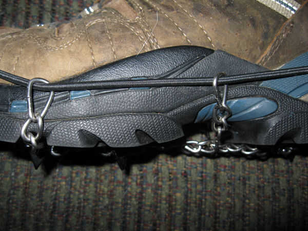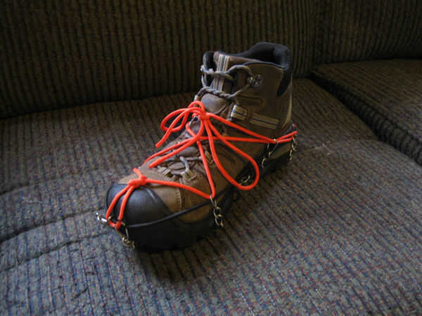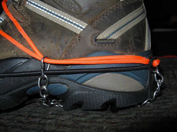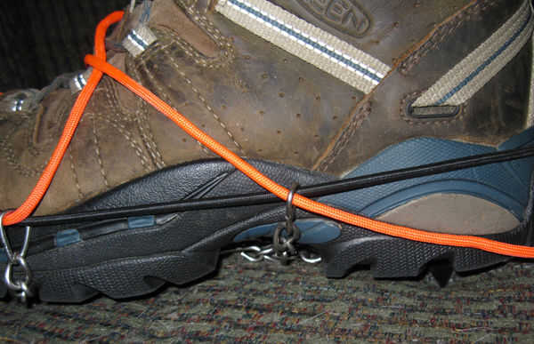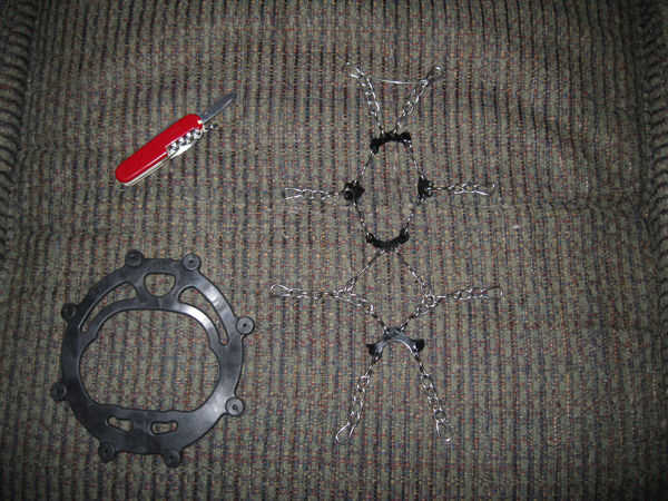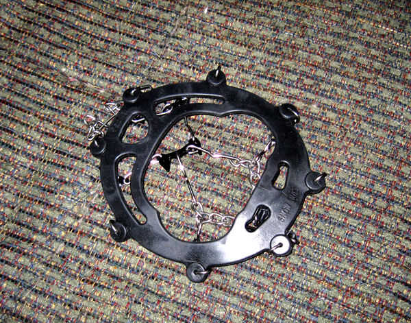 Nota: Al hacer esto en casa, asegúrese de poner las cadenas planas para que no estén retorcidos. También, los compré tienen lazos 'triangulares' a las cadenas de crampones. Decidí poner el cordón a través de la 'grasa'. HYOH.