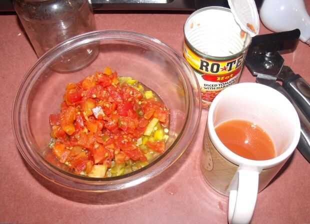¿Abrir y drenar la lata de tomates rotel y chiles (guardar el jugo, recuerda que limpieza final de la jarra)?