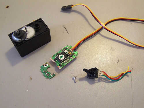 motores servos están diseñados para girar un máximo de +-130 grados. Pero pueden modificarse fácilmente para hacer giros de 360 grados. El hack está muy bien documentado para los varios modelos de motor servo. Aquí utilizo un servo Hitec HS-325HB com