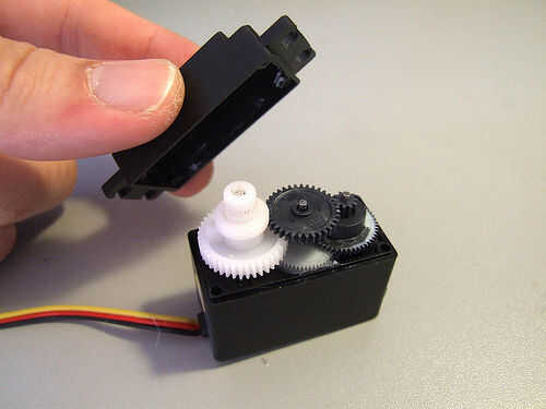 motores servos están diseñados para girar un máximo de +-130 grados. Pero pueden modificarse fácilmente para hacer giros de 360 grados. El hack está muy bien documentado para los varios modelos de motor servo. Aquí utilizo un servo Hitec HS-325HB com