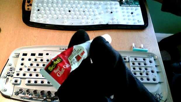 ADVERTENCIA: no poner caliente pegamento en desarmar SUPERGLUE - realmente apesta y los humos hace que tu aguijón de ojos.Aplique el pegamento a todos los del teclado Num Lock, excepto la tecla Supr. La tecla Supr se utilizará como una liberación rápida para ayudarle a conseguir el teclado numérico del teclado.