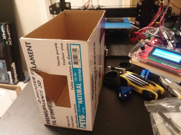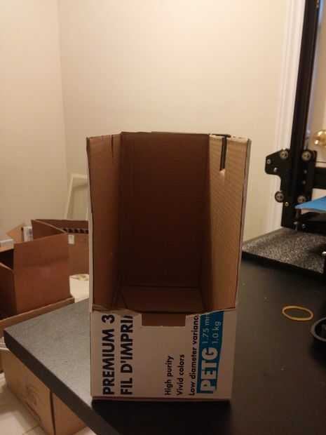 Comienza por cortar la parte superior de la caja y luego sobre a medio camino abajo de la caja en un lado (como en las fotos). Vas a necesitar la tapa abierta para montar el carrete en y el frente para dejar los filamentos a través. Puede ser creativos y agregar un cepillo o una esponja para limpiar el filamento ya que pasa a través, pero no lo hice.