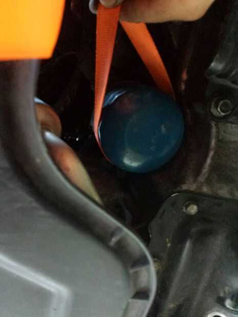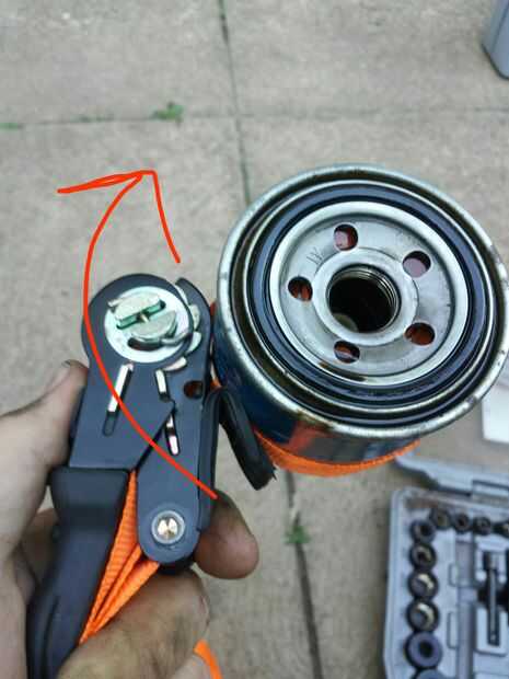 Primero poner el bucle que hiciste sobre el filtro de aceite y la correa de trinquete casi todo el camino. Deben tener firmemente bastante que al tirar el trinquete que se pone más en una dirección y afloje en la otra dirección.