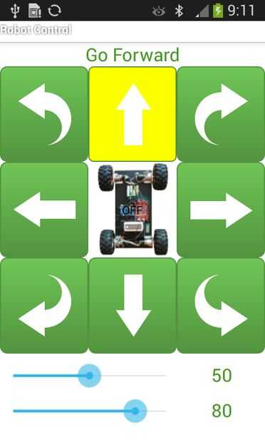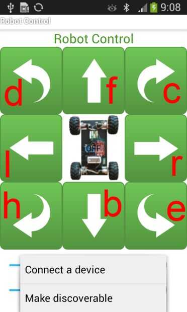 El carácter único se asigna a cada botón de la aplicación para Android como se muestra en figura. Puede editar el código de Arduino y utilizar mi aplicación Android para controlar tu propio dispositivo (no sólo este coche RC).