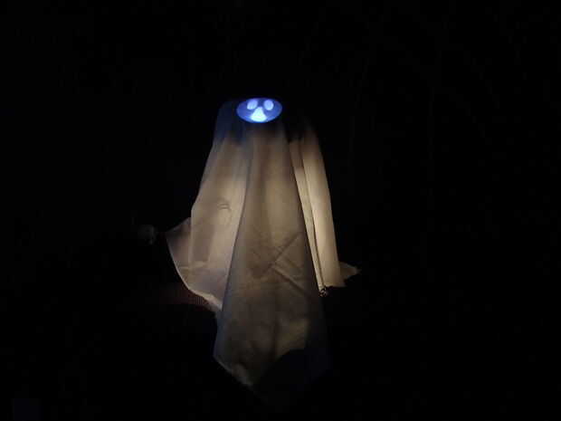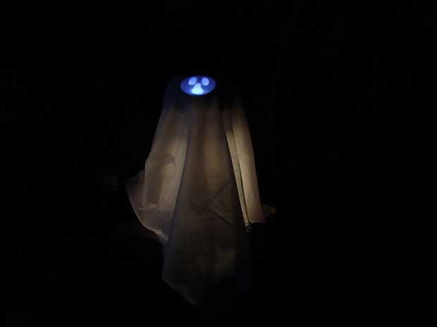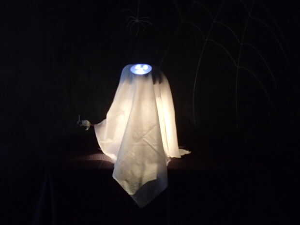 Clyde se disfraza como un fantasma espantoso en este Hack de Halloween. Fantasmas Clyde tiene algunos trucos encima de su hoja: un sensor de movimiento y un ventilador de ordenador añaden algunos comportamiento responsivo espeluznante. Programa de Clyde a su hoja y sus luces del alboroto cuando se activa el sensor de movimiento. Apariciones de LED!