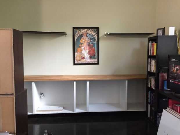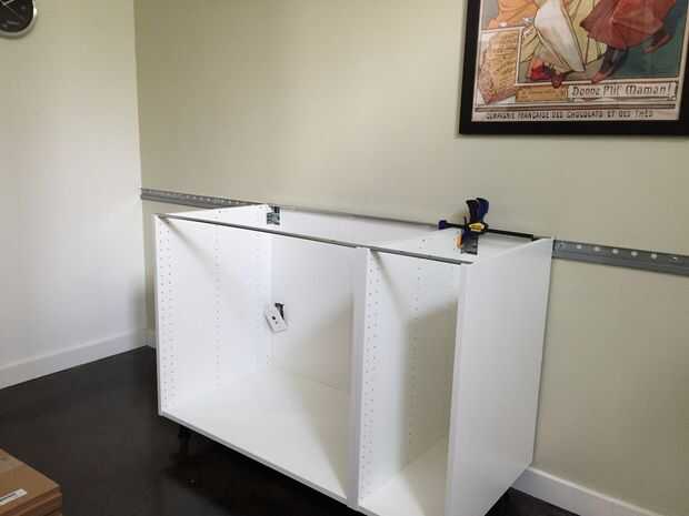Es todo sencillo; No tengo muchos consejos fuera de las instrucciones de que IKEA ofrece. Asegúrese de que eres muy precisa cuando se instala el riel de nivel. Una vez que el carril está para arriba, empiece con el gabinete de centro y a la salida, luego atornille las encimeras en su lugar y finalmente colocar las puertas.