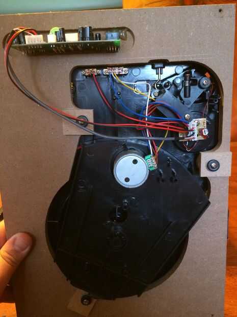 Tiempo para abrir el reproductor y ver lo que estamos tratando. En mi caso se trataba de una simple cuestión de quitar cuatro tornillos de cabeza phillips y levantando una tabla que el tocadiscos y los controles están montados en. Era cómodo, así que tuve que conseguir un destornillador de cabeza plana y levante un poco. Dependiendo de su reproductor, puede ser más que esto.