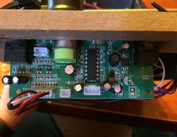 Una vez que la Junta está suelta Levante cuidadosamente porque habrá cables conectando las piezas en el tablero para piezas montadas en el caso (conector de alimentación, salidas, altavoces, etc.). Estos cables se conectan a un circuito impreso con conectores extraíbles que necesitará Desconecte antes de poder retirar completamente la Junta.
