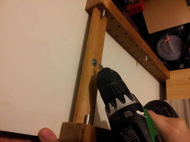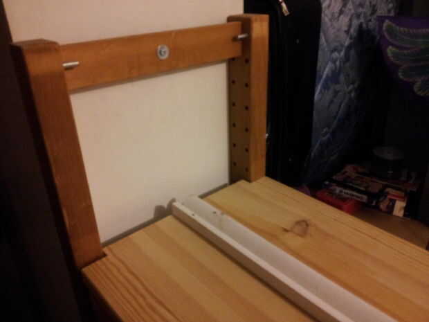 Ahora, toma sus clavijas e insértelos en los orificios de la parte superior, entonces cada hoyo 7 abajo (dejando 6 agujeros vacíos) para que cuando llegue el último de ellos, que quede directamente en el soporte en la parte inferior y deja unos 10 cm de espacio por debajo para el flujo de aire, facilidad de limpieza y prevención del molde (esto es especialmente importante en la alfombra y en sótanos, donde la humedad puede recoger debajo del estante y lo putrefacción)
