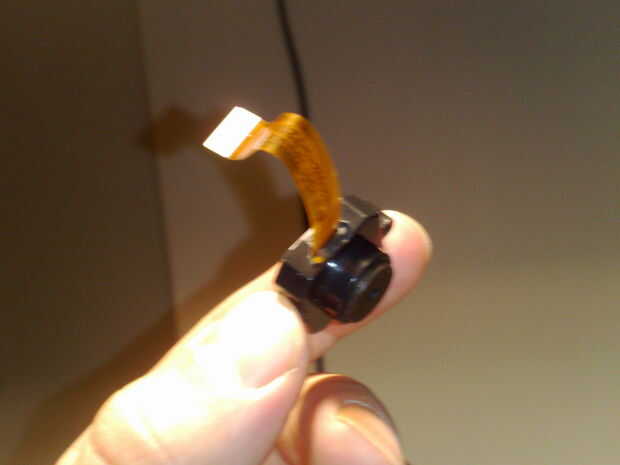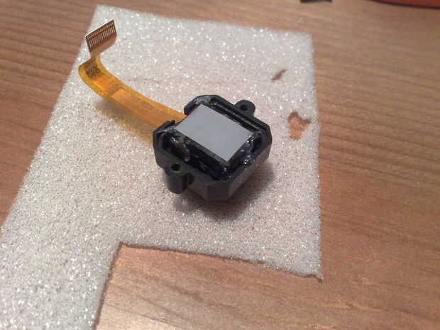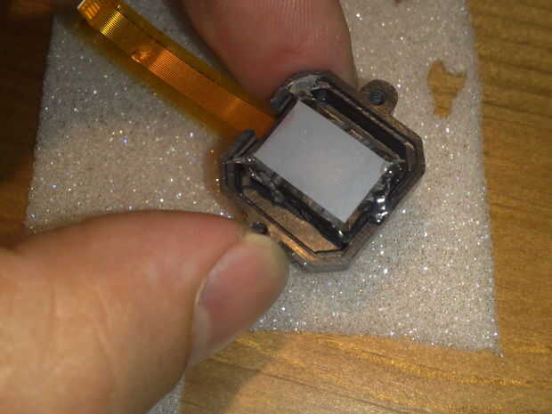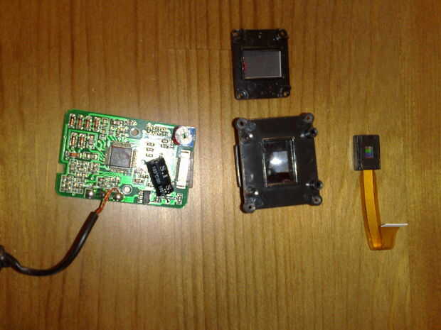 Usé la pistola de pegamento para unir el sándwich. Como se puede ver, ya puse en la carcasa de la cámara = Destornillar los dos tornillos, que mantiene unida a la cámara. Sacar la placa de circuito (simplemente tirando). A continuación, un agujero en la cubierta para el cable de cinta y y colocar el sandwich dentro de. Al lado, donde la película de sombreado es en el lado del objetivo no.