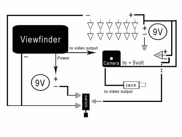 Tiempo para instalar todos los componentes y cables según el esquema. Asegúrese de probar cada compnent en el camino. Básicamente todos los motivos van a y fuera del interruptor. El arsenal del LED, micro cámara y LED de potencia son alimentados por una batería de 9 voltios y el visor está alimentado por otro.