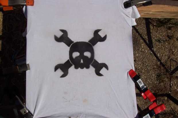 He encontrado que rociar la máscara con pintura diluyente me permitió a soplar el exceso de pintura de la pantalla después de la pintura a través de él. Hizo algunas impresiones, deja la pintura secar unos días y luego hizo más impresiones con la limpieza de la pantalla. Creo que la pintura seca desde el primer uso de días probablemente actuaba como pegamento y guardado la plantilla de caerse cuando spritzed con disolvente de pintura. Una vez hecho esto, recomiendo hacer la primera impresión, dejándola secar y luego hacer las otras con una limpieza. He tomado 18 impresiones desde mi pantalla. Había limpiar antes, creo que las impresiones más adelante habría más pintura ir a través. La otra cosa que he considerado es adelgazamiento de la pintura antes de rociar. Esto podría permitir una penetración más profunda de la pintura. A $3,58 para las camisas y nada para la pantalla, este fue un proyecto muy barato.