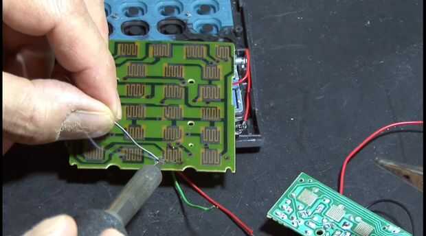 Ejecutar dos cables pequeños de cada lado del contacto de la tecla de la calculadora que decida utilizar. Luego ejecute los dos cables a los contactos de la reproducción en el módulo. Ejecute los dos cables del módulo a los extremos positivos y negativos del terminal de la batería de calculadora. Cuando se presiona la tecla de la calculadora, completará el circuito por esa llave y también el botón de reproducción.