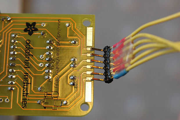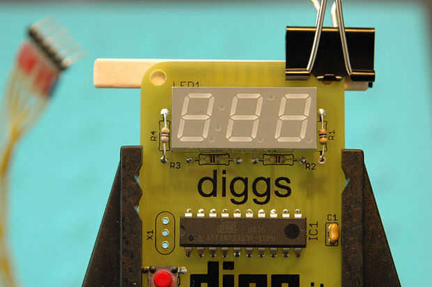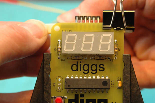 - Clip el palo de un lado a la parte posterior de la placa de Digg Button sobre las almohadillas de soldadura.