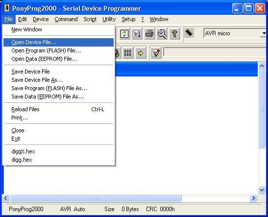 Una vez que has descomprimido los archivos, puede usar ponyprog 2000 para subirlo. Todo lo que hacemos es seleccionar "Abrir el archivo de dispositivo" en el menú Archivo y elegir el archivo diggX.hex. Luego selecciona "Escribir todo" en el menú de comandos. Con suerte pequeña, ponyprog se escriba y verifique el nuevo código y su Digg Button debería empezar ejecutando el nuevo firmware (se puede ver esto, vaya por rápidamente en el vídeo).