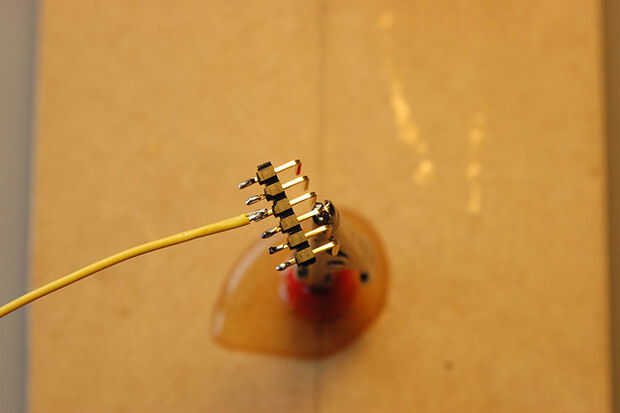 Cuando todos los cables son soldados y enfriados, puede ayudar a estabilizar el encabezado si usted Deslice la tira de plástico lo más lejos de la conexión de soldadura como sea posible. La forma más sencilla de hacerlo es colocar el ensamblado de cabecera/de alambre sobre la mesa con los cables mirando hacia arriba. Utilice un destornillador pequeño para presionar con cuidado el plástico entre los pines hacia la mesa. Con la cantidad correcta de presión el plástico comenzará a deslizar.