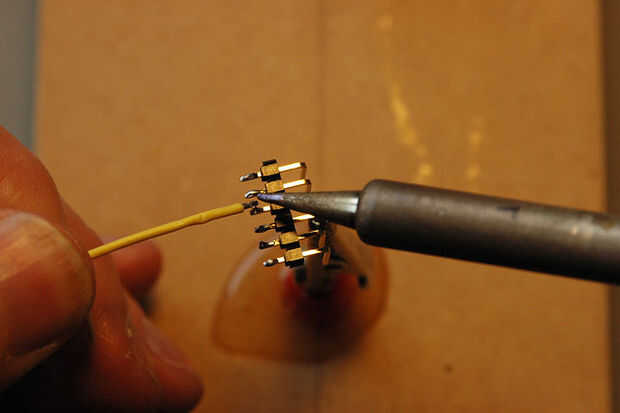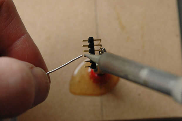 El primer alambre de la soldadura una vez se han enfriado las patillas de la cabecera de estañado, en. Comience en un extremo de la cabecera y el trabajo hacia el otro para que sea más fácil conseguir la punta cerca de la conexión de soldadura. Tenga en cuenta que usted está de soldadura a la parte más corta, ángulo no recto de cada pin. Sosteniendo cada cable con su conector, lo unico es la soldadura. Trate de hacer que los cables se extienda directamente de cada pin en lugar de en cualquier ángulo.