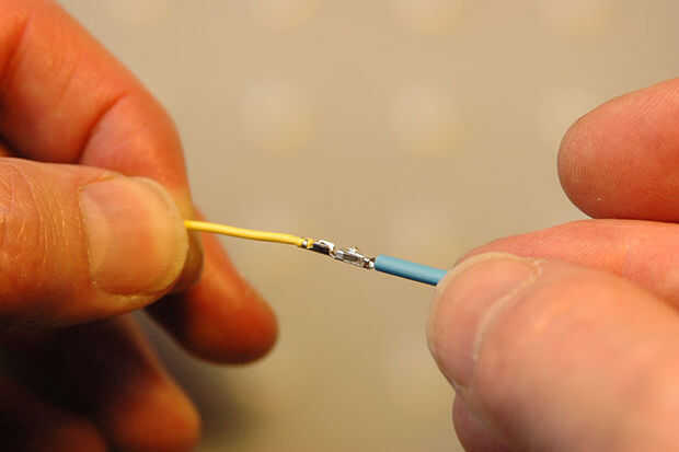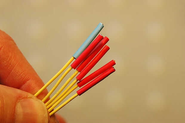 En primer lugar, deslice un trozo de tubo termo-retráctil en cada zócalo del perno. Llevarlo como ras lejos como sea posible hasta el final del conector, luego utilizar su técnica ahora experto con la pistola de calor para reducir cada pieza. Hacen muy ordenados conectores que son fáciles de usar. Si usas diferentes colores de tubería de encogimiento de calor, asegúrese de que los colores de compensación son en el mismo cable. (por ejemplo, en la foto, cable "A" utiliza tubería azul en ambos extremos y todos los otros cables usan rojo).