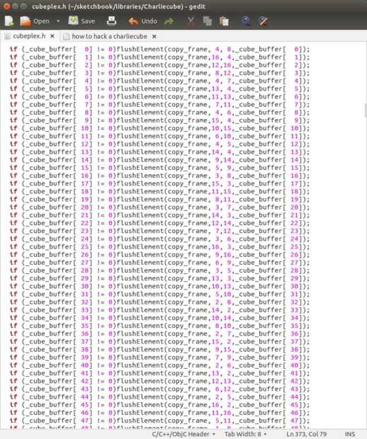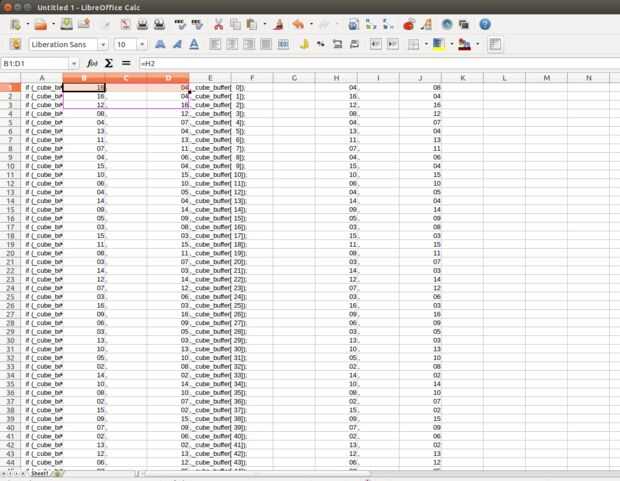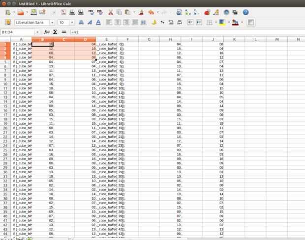 Una vez que tengas el mapa correcto para su cubo, volver a tu hoja de cálculo y encontrar que mapa, comenzar una nueva hoja y copia que mapea datos (solo el texto y números, no hay fórmula ni nada). Copiar la columna B y pegue en una columna vacía de la columna de la izquierda, copia D y pegarla en la columna B, copia el la copia de la columna B, en la columna D. Ahora usted tiene una mesa para ánodo común LED, pero sólo son 3/4 derecho, y no sabemos cuáles están equivocados. Puesto que la mayoría está bien, es un verdadero buen comienzo, deberíamos podemos decir cuando tratamos de este código. Necesitará copiar los datos en el archivo cubeplex.h utilizando el mismo procedimiento que hicimos antes.