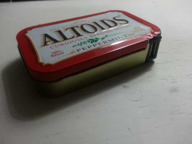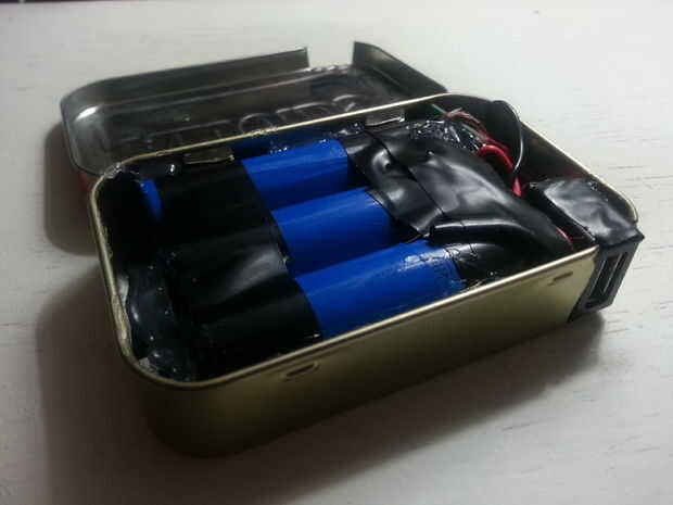 Dentro de las conocida altoids lata mentiras tres 2.200 mah baterías de iones de litio. Los tres se corrió en paralelo para crear una batería de 6.6 amp o 6.600 mah. Que triplica el tiempo de carga! Si una batería puede cargar su teléfono 75 por ciento de los tres pueden triplicar el sentido! 75 x 3 = 225 por ciento!