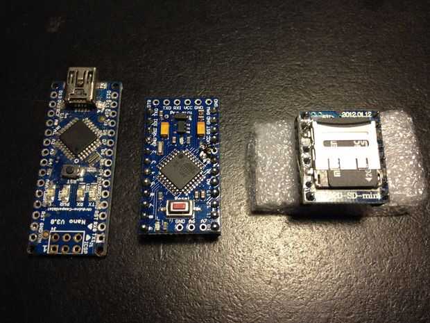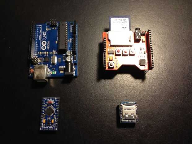 Pueden hacer escudos Arduino y sonido más pequeño y más baratos para el uso más compacto. Arriba están las comparaciones entre un Arduino Uno completo con protector de la onda y un Arduino Nano, un Arduino Mini Pro (ambos son completos reemplazos recomendados por la ONU) y un mini protector de la onda.