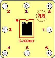 El bloque de circuitos de Snap (U14) que sirve como el portador PICAXE es especialmente marcado más fácilmente identificar los pines en el chip del microcontrolador PICAXE. Pensar en el chip como un error cuadrado con ocho patas. Hay una muesca en la parte superior para ayudar a orientar el chip y un pequeño punto marcas pierna 1. Las piernas y los pernos pueden a veces confundirse, pero en el bloque de U14 las piernas (y los broches correspondientes conectadas a las patas) están marcados en rojo 1-8 va en sentido antihorario.