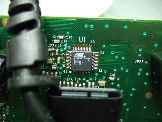 Para su información, esto es el cerebro del controlador. Todas las entradas de botón finalmente terminan aquí. Así que ¿por qué no nos sólo la soldadura directamente a este chip? Bueno, cuando veas cuán pequeño es este chip, usted sabrá. El aficionado promedio no tiene la capacidad de la soldadura a las cosas de este pequeño. Se puede ver que los pines están etiquetados en el pin 1, 12, 13, 24, 25, 36 y 48. Pero estoy divagando.