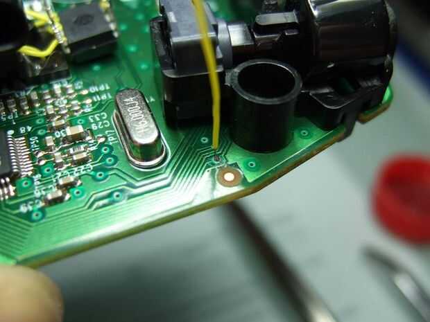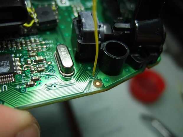 Introduzca el extremo del hilo con cuentas y sumergido de flujo en la vía que previamente ha raspado. Sostiene allí el alambre, toque la punta de tu soldador a la articulación del tiempo suficiente para que la soldadura a "desaparecer". En realidad, algunos de la soldadura se haya absorbido en la punta de la plancha. Si tienes suerte, el resto de la soldadura consiguió aspirado en/sobre la vía. Si te fijas bien, verás un pequeño "Volcán" de soldadura. Esto es una señal de una buena conexión. El mejor signo es darle un tirón ligero para ver si permanece adherido. :)