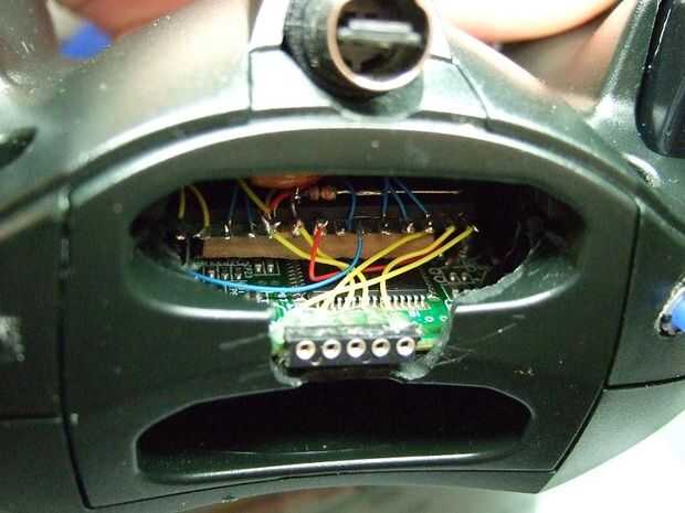 En este controlador particular, he instalado un microcontrolador 28 pines que tiene entrada y salida de acceso a casi todos los botones e incluso algunos de los controles del pad y stick. Tuve que eliminar completamente el puerto periférico inferior, para hacer la habitación. También puse un conector breakaway derecha en el controlador (ver parte superior de la foto).