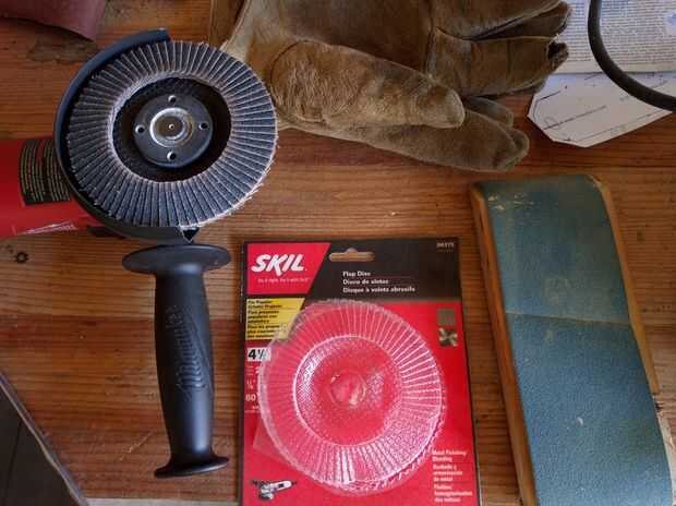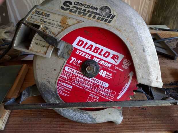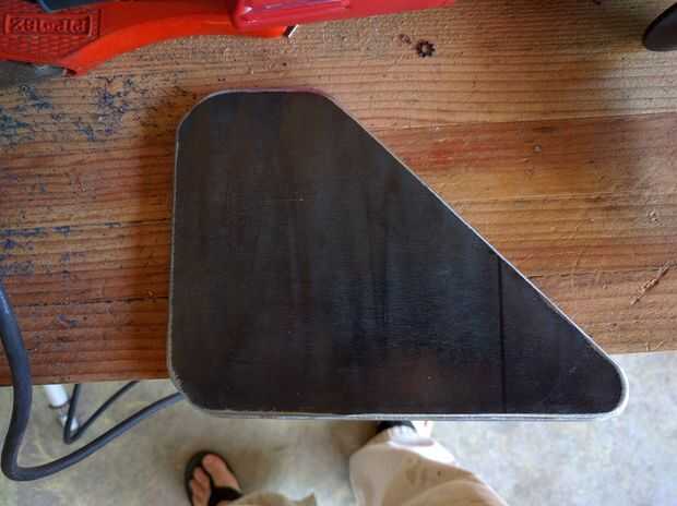Decidí colocar una placa de acero gruesa de 3/16 de pulgada en la parte inferior del brazo. Hay una barra de 3/16 de pulgada en la parte inferior de la silla, sosteniendo el brazo, así que pensé que este era el camino a seguir. Tengo una placa de 6 "x 12" de Amazon por unos $15 y utiliza estas herramientas para cortar por el centro a 45 grados. La hoja del Diablo demonio de acero es costosa, pero cortar a través de la placa de acero como la mantequilla. Demandó a un disco de la aleta en mi amoladora angular y una esmeriladora de banco para los bordes del vestido. Las medidas de las piezas resultantes fueron 3", 6", 9" y la diagonal que no mido (pero debe ser 6*sqrt(2)").