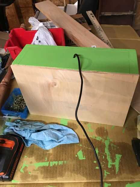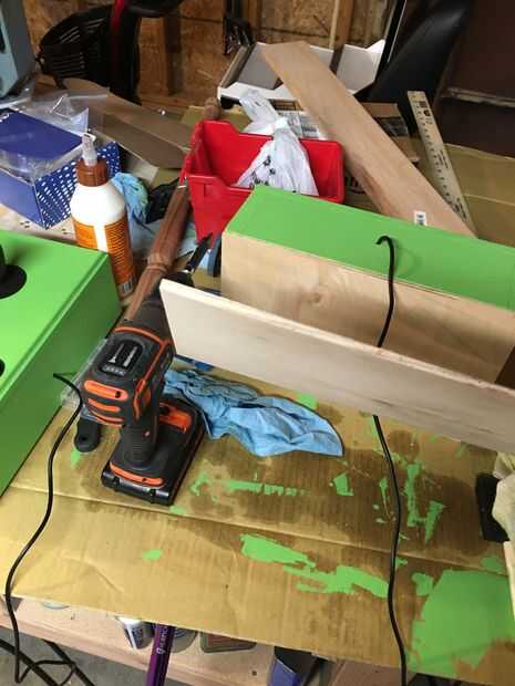 Iba a usar tornillos en la mía pero luego decidí que mi hermana, su marido ni sus hijos tenían cualquier negocio cerca de mi trabajo hermoso así que usé mi pistola de clavos con 3/4 en broches para sujetar un panel de madera contrachapada fina que corté de algún retal que había dejado.